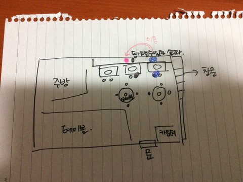 저기 보이는 핑크색 점이 제 자리 였구요, 옆에 검은 점이 어머니, 그 맞은 편이 저희 아버지 셨습니다. 그리고 옆 테이블 두 파란 점이 그 커플이구요. 저희 어머니랑 제쪽에 앉은 분이 여자였고, 맞은 편이 남자였습니다.