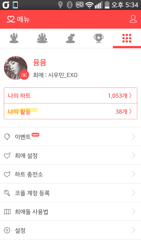 최애돌 켜고 아이콘중 맨 오른쪽 네모 9개있는거 클릭하면 내 정보 뜨거든.