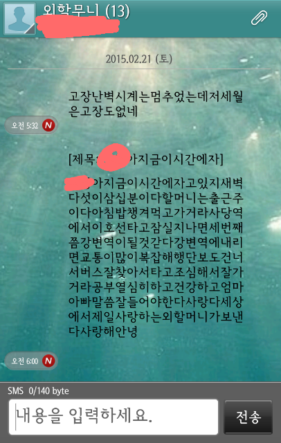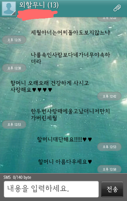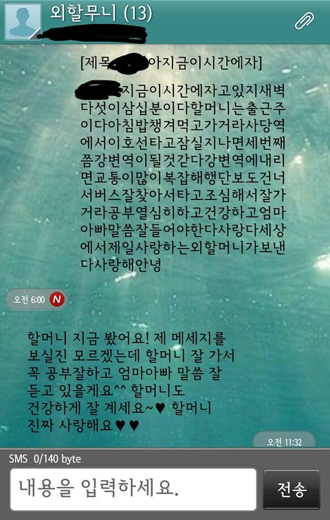그래서 저번부터 간간히 문자로 글자쓰는법만 일단 알려드렸어요 ㅎ 종이에다가 자판그려드리고.. 그래서 이번 설날에 다시 할머니댁을 갔는데 할머니가 진짜 문자를 잘 치시는거에요..매일 연습하셧다며.. ㅠㅠ 그래서 이제 보내고 싶다고 하셔서 한시간동안 반복하면서 알려드렸어요 ! 그리고 잘하셔서 보는법도 알려드렸고요 ! 그 뒤로 할머니가 굉장히 잘하시는거에요! 그래서 제가 할머니보고 저한테 매일 문자하시면 저도 답장해드린다고 하고 가족들은 먼저 가고 ㅎㅎ 저는 동갑인 친척여자애 집에서 하룻밤 더 잤어요 !그리고 오늘 아침에 일어났는데 문자가 와있어서 봤는데 너무 눈물나서 판에 글씁니다 ㅠㅠ 그냥 펑펑 울었어요 ㅠㅠ할머니가 아침에 일가시는것도 슬퍼서 울고 장문이나 보낸것도 울컥하고 ㅠㅠㅠㅠ 진짜 할머니 있을때 잘해드릴려고요 ㅜㅠ 할머니 사랑해요♥
