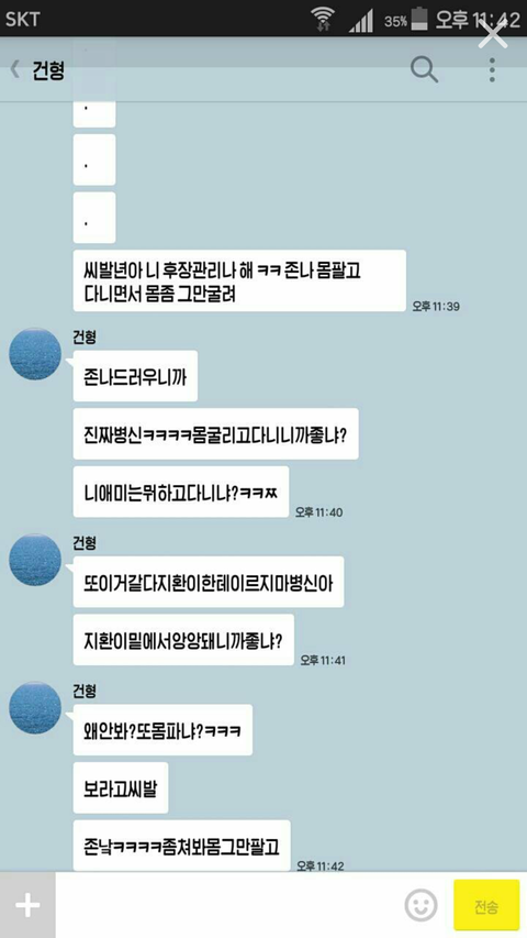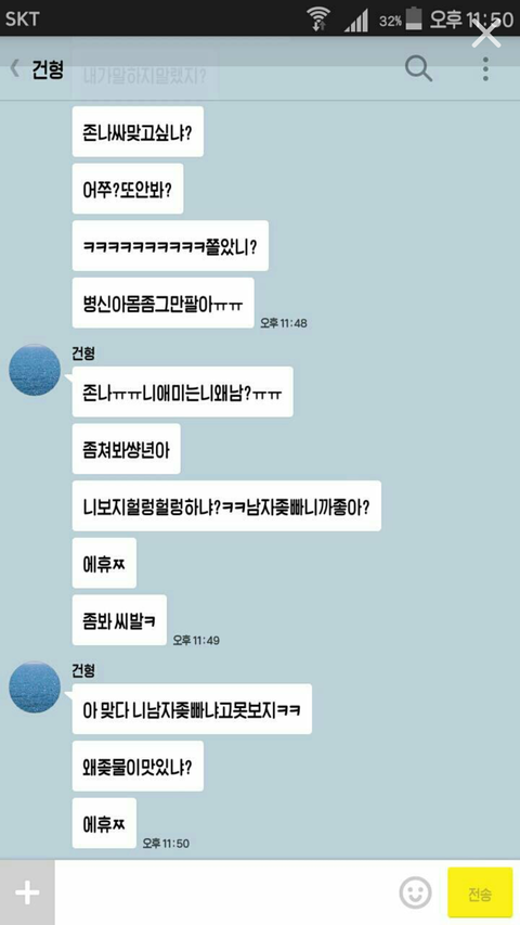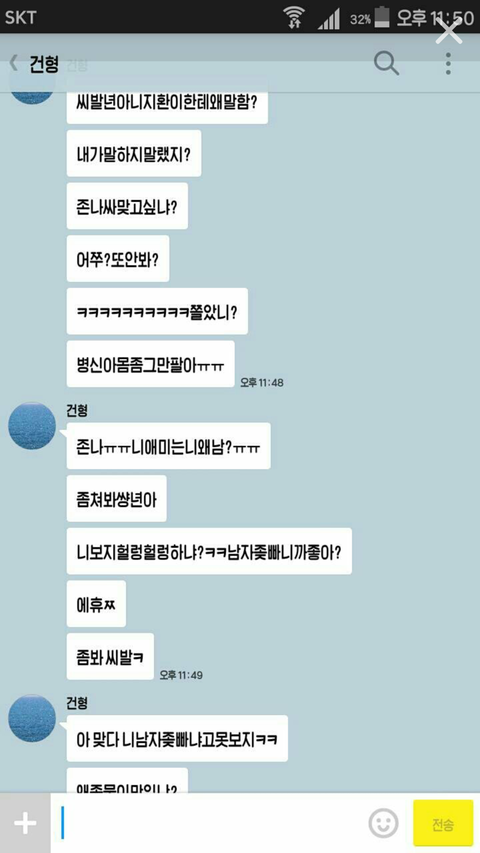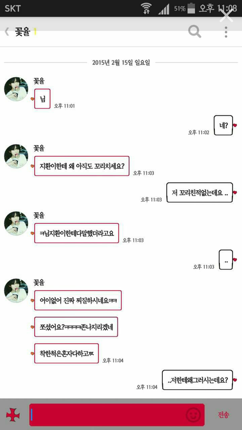 지은언니랑 지환이라는 애랑 엄청 친해서 서로 장난도 많이 치는 사이였는데 어느날 지은언니가 지환이 프사가 맘에 들어서 프사 개사랑해♡ 라고 했대요 근데 이건 이성간에 고백이 아니라 프사가 이쁘다고 좋다고 한 뜻이잖아요 근데 어떤 꽃율이라는 분이 그걸보고 지은언니한테 꼬리친다고 그렇게 말하는거에요 (밑에 사진참고) 막 욕이란 욕은 다하고 입에 담을수 없는 말까지, 패드립 성드립 막 하고 솔직히 이건 아니지 않나요? 이게 저번주 부터 한거래요 너무 어이가 없어서 이렇게 글을 쓰는데 지은언니가 저런거에 많이 약해서 제가 그만하라고 단톡 만들어달라 그랬는데 저 얍쌉한 놈이 자기 할말하고 차단하고 그걸 또 반복하고 그런대요 근데 중요한건 지환분이 솔로고 저 꽃율이라는 분이 지환이 친구도 아니래요 그리고 지은언니 톡디는 또 어떻게 알았는지 계속 욕을 하는데 저만 때리고 싶게 하는거에요? 제가 잘못이해한거에요?
