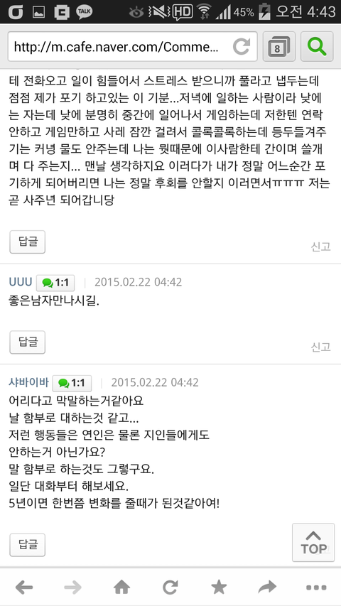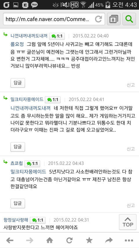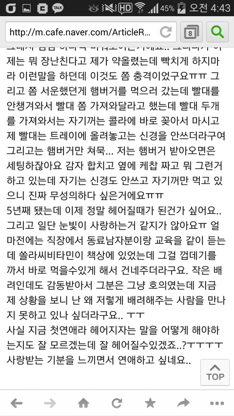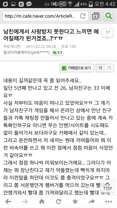 1. 여초에 남친 맘이 떠난거 같다는 글이 올라옴. 이유를 보니 (1)빡치게 하지마<-충격 (2)게임하는거 (3)콜라에 빨대 안꽂아줌<-서운 (4)감자 안합치고 자기 먹는거에만 열중 =>종합 : 헤어질때가 됐다 느낌 (5)직장 남자동료가 비타민 까줬는데 왜 이와같은 배려남을 만나지 못하고있나 한탄