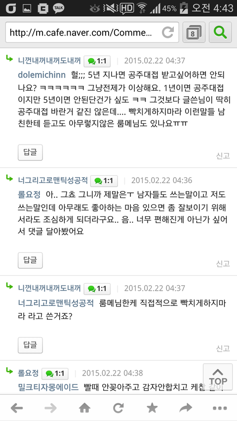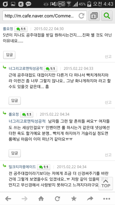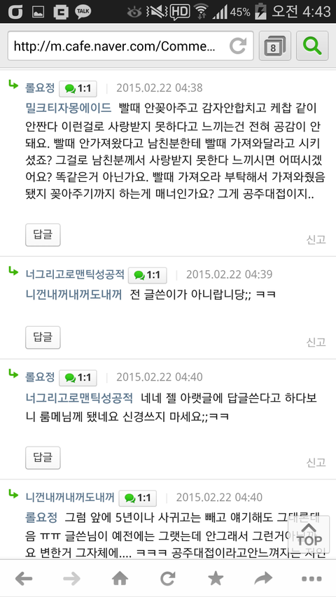 댓글에 공주대접 받길 원하냐는 글이 달리자 다른 여자들한테 공격받기 시작. 이게 왜 공주대접이냐 따져물음. 그러자 본인은 남친한테 빨대가져와라 시키는건 되고 빨대가져 와준 남친은 고작 콜라에 안꽂아줬다고 욕먹어야되냐 하자 더더 공격당함. 심지어 왜 5년이 지나도 공주대접 받길 원하면 안되냐는 식으로 따져물음(기본적으로 남자한테 공주대접 받길 원함ㅋ)