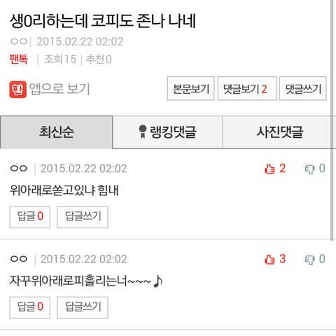 생1리중인데코피도 졸라나서 내 피ㅠㅠㅠ빈혈오겠다 이런글인데 댓ㅋㅋㅋㅋ저가사로 나도모르게 육성으로불러봄