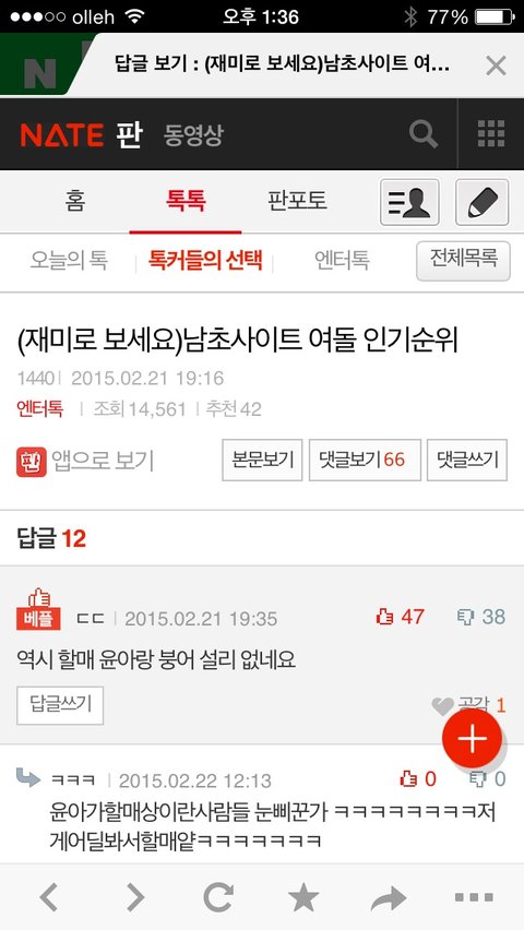 그 톡에 특정팬덤까는글이 10개도넘는게 충격이었음..추천수도소름이었음