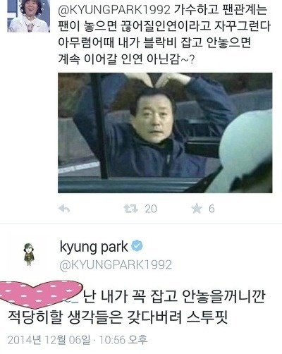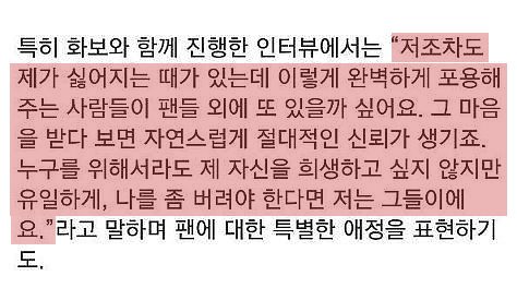 그럼 그때 가서 이제 팬질 손 털자 할 때 하더라도 내가 내 존재도 모르는 사람한테 혼자만 일방적으로 시간 낭비했구나,쓸데없는 짓 했구나, 하면서 후회하지는 않게 해주고 싶어요.