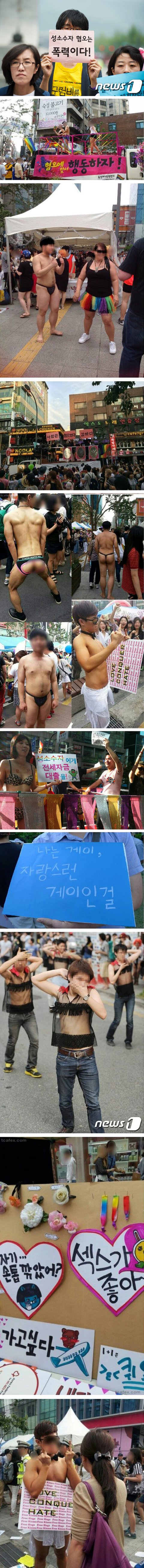 모든 성소수자가 저런것은 아닌거는 아는데, 성소수자에 대해서 잘 알지 못하는 사람들이 이런사람들을 통해서 먼저 겪으면 저런 인상이 확 박혀버림. 서양에서는 아무래도 훨씬 더 오픈되어있으니까 저런거를 해도 옹호해주는 사람들이 많지만 여기는 한국아님? 보수적인 사람들이 얼마나 많은데, 저딴 행동을 하면서 게이도 사람이에여!! 우리 권리를 알아주세여!! 이럼? 대한민국에 어느누가 티팬티만 입고 거리를 활보하면서 섹.스가 져아 헤헿 하는데 우왕~ 역시 성소수자 짱! 이러냐 별 미.친.놈들이 다 있네 시.벌. 이러지