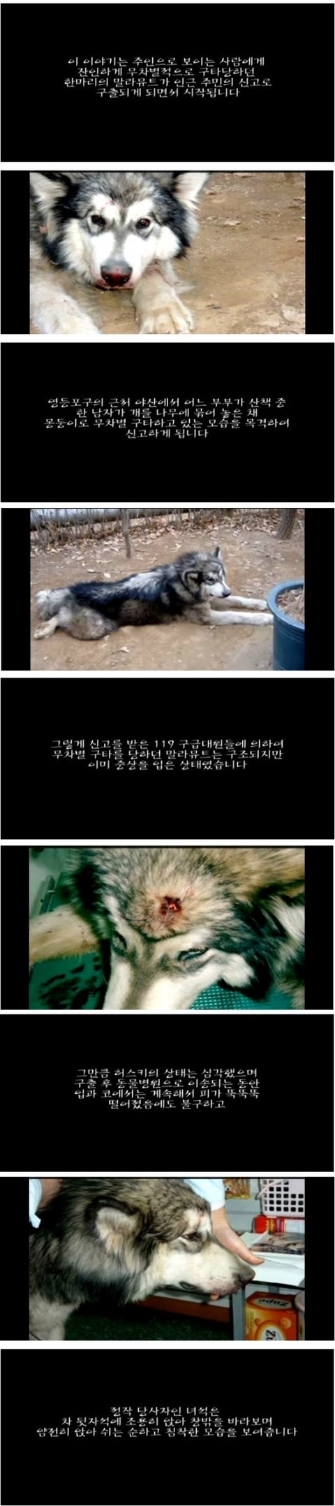 장군이 이야기 사진보고 울컥했네요 피 흘리는 사진보니 가슴이 아프네요ㅠㅠ 나무에 묶어놓고 몽둥이로 때렸다니 화가나네요 동물학대범 분명 천벌 받을겁니다 장군아 아픈기억 다 잊고 이제 사랑 받으며 행복하게 살아