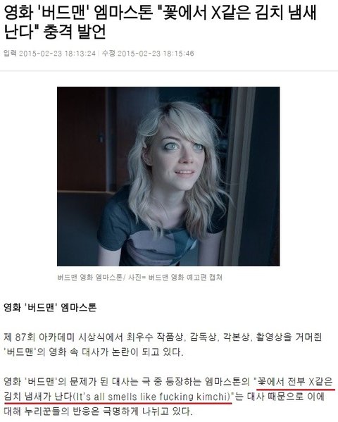 김치냄새가 엿같다고 해서 기분나쁜건 어느정도 인정하지만 이렇게 반발할만한건 너무 제국주의라고 생각함. 우리나라 영화 '괴물'에서도 미국인이 처음에 한강에 화학폐기물을 한강은 넓으니 그냥 버려버리자는 말이 나오는데 미국인을 파렴치한으로 몰고가는 장면이기도 했음. 사실 환경을 생각하는 사람들은 미국에 훨씬 많은데도 불구하고 그리고 다른 외국영화를 봐도 뭐 니그로네 , 짱깨, 쪽발이 다 나오는데도 불구하고 아무소리 안한다. 심지어 치즈나 삼치통조림 이런것도 얼마나 욕많이 하는데... 우리만 너무 민감한거 아닌가 생각이든다