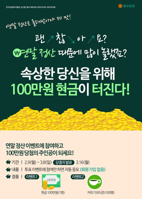 속상한 마음을 부여잡고... 이것저것 보고 있었는데, 동부증권에서 연말정산 이벤트를 진행 중이더라고요. 투표 이벤트에 참여만 하면 자동 응모가 되는 완전 간단한 이벤트! (회원 가입도 없음)