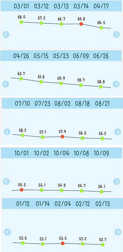 10~1월까지 중간에 비어있는건 왔다갔다로 거의 동일한 몸무게를 유지했기 때문이에요.