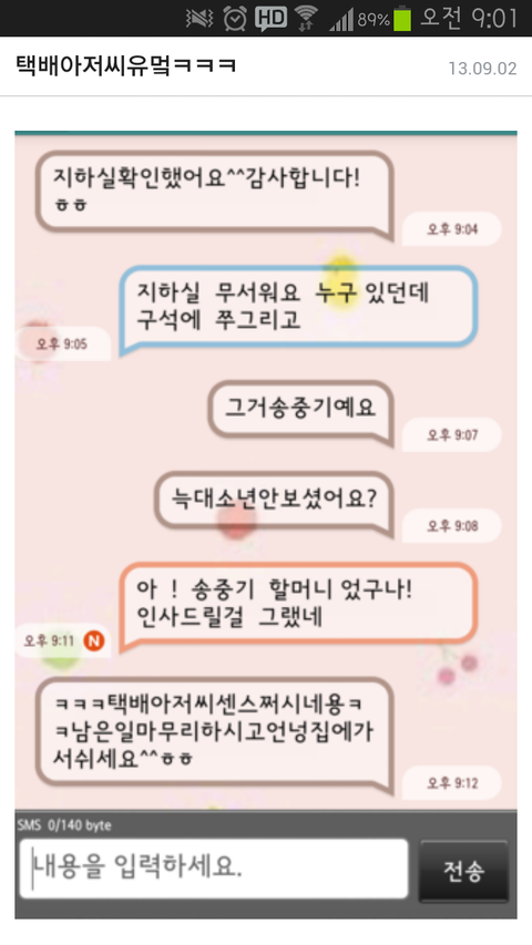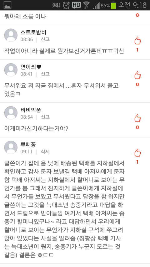 정리해줌 택배 아저씨가 지하실에서 할머니로 보이는 형태를 목격하고 문자로 알려줌- 글쓴이가 늑대소년 드립을 치면서 송중기라고 함- 택배 아저씨는 송중기가 누구인지 잘 모르셔서 할머니 성함이 송중기인 줄 알고 인사드릴걸 그랬다고 함(실제로 할머니같아보이는 형태를 봤다고 말뚝박은 게 된 거)- 글쓴이는 드립으로 받아들이고 훈훈하다며 올림;
