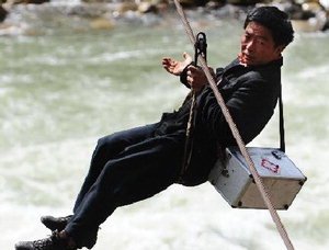 그는 거의 매일 외줄을 탄다. 중국 윈난(雲南)성 누장(怒江) 상류의 협곡에서 줄을 탄다. 협곡은 길이 125m의 쇠밧줄로 연결돼 있고 아래에는 세찬 강물이 요동친다. 곡예와 같은 쇠줄 타기로 강을 오가기 28년. 그 사이 그에게 '외줄타기 챔피언'이라는 별명이 붙었다.