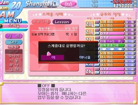 연기,댄스,노래 레슨 받으며 실력을 쌓고 한국,일본,중국 스케줄을 잡으면서 인지도와 인기도를 올려야하는 게임이었어요 실력과 인지도가 어느 정도 쌓이면 CF나 드라마 오디션이 들어오기도했지만 실력이 안되면 오디션이 들어오지도 않았죠 휴식없이 스케줄을 무리해서 잡으면 보아가 과로로 쓰러지기도 하고ㅠㅠㅠ이거 은근 재밌게 했던 기억이 나네요