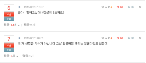 아 물론 여돌을 변호해주시는 분들도 많았습니다ㅋㅋㅋㅋㅋ 다만 내가 충격을 먹었던 거는 남돌판에서는 성열 두유힐미를 변호해주는 댓글이 2개나 베플이었던거에 비해 여돌판에서는 오히려 실력을 평가하는 글이 더 많았다는 거죠ㅋㅋㅋㅋㅋ 물론 상반된 반응을 캡처해서 올린것이기 때문에 모두가 그랬다고는 하지 않겠습니다