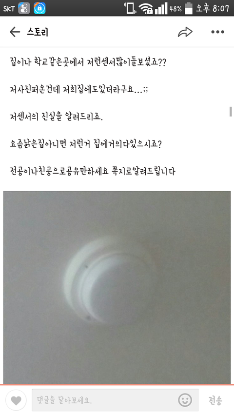 내친구 썰같은거안보구 친구들이랑소통할려고카스하는데 저게 사람들숨쉬는지확인하는거라했데ㅋㅋㅋㅋㅋㅋㅋㅋㅋㅋㅋㅋㅋㅋ 불나서연기감지되면물나오는거아냐? 아웃겨서ㅋㅋㅋㅋㅋㅋㅋㅋ