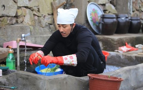 빨간 고무장갑에 쫄쫄이 입고서 파다듬는 차승원 익숙함
