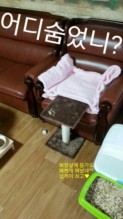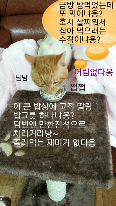 더줬더니 어느정도 배를 더 채운후 만족감이 들었는지 쇼파로 올라가 만족한다는 얼굴로 쳐다봐줬다고 하네요.