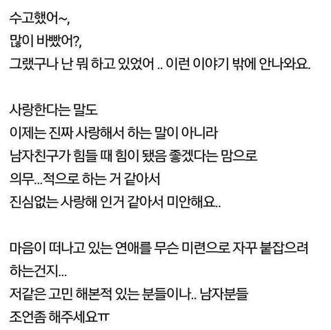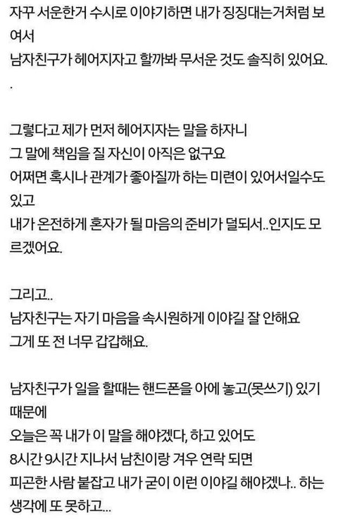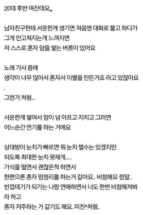 우연히 sns에서 본 글이 너무 공감되서 첨부했어요.. 정말 제 상황이랑 똑같았고 저도 저 사연처럼 무조건 제가 다 참고 이해해주고 취업준비라는 힘든 시기를 넘겼는데 취업하자마자 변해버리는 그사람 모습에 많이 지쳤고 실망도 했고.. 1년 8개월이란 시간동안 서로 이해해주고 잘 만나면서 큰 싸움 한번 없었는데 근 3달 새에 제가 서운하다고 3번정도 크고 진지하게 얘기하면서 이런 점 고쳐줬음 좋겠다 나도 노력하겠다 해도 변하려는 모습이 보이지 않아 제가 먼저 헤어지자고 했네요..