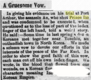 ↑ 【뉴욕=뉴시스】노창현 특파원 = 안중근의사가 이토 히로부미를 저격한 것에 대한 선고는 3년형이면 충분하다는 주장이 제기된 사실이 105년만에 밝혀졌다. 안중근의사의 사형언도일인 2월14일을 맞아 뉴시스가 입수한 이 내용은 1911년 뉴욕에서 발행된 ‘디 인디펜던트(The Independent)’의 상반기 연감 집필자였던 존 하이드 디포레스트가 ‘1910년의 일본(The Japan of 1910)’이라는 글에서 소개한 것이다. 또한 싱가포르 영자신문 ‘더 스트레이트 타임스’는 이토 저격 두달 후인 1909년 12월21일 “저격자에게 사형이 언도될 것인지는 아주 회의적이다(too doubtful)”라고 언급하는 등 과도한 선고를 경계하고 일제의 짜맞추기식 재판을 예견하는듯한 기사를 실었다. 사진은 1910년 3월16일 안중근의사의 ‘단지동맹(斷指同盟)’을 보도한 스트레이트 타임스 기사. 2015.02.13. <사진=싱가포르국립도서관 DB> robin@newsis.com