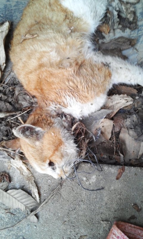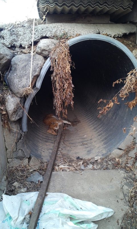 음식물 쓰레기 주변을 보았는데 그 밑에 하수구 구멍이 있고 죽은 냥이 한 마리가 누워있었습니다. 외상이 전혀 없어서 어디가 아파 앓다가 하수구 구멍 밑에서 죽거나 무엇