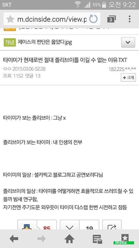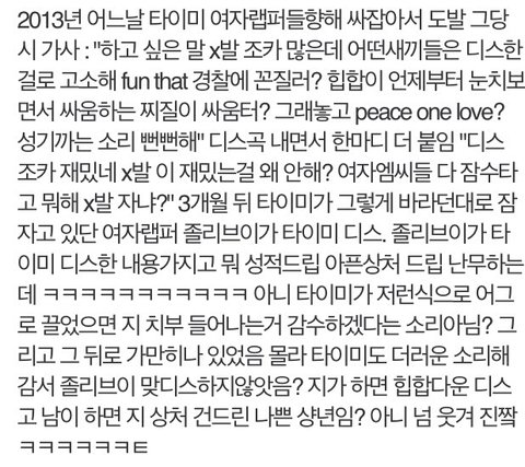 타이미가 좋은게아니고 졸리브이가싫음 목소리 ㅈㄴ싫고 눈초롱초롱하게뜨고쳐다보는거 한대쳐버리고싶음 특히 실실쪼개는얼굴 ㅋㅋㅋㅋ뷁 토나와 그리고인터뷰할때마다 남디스하는얘기만하는꼴도 보기싫어 내려왔으면그만해야지 솔직히조카 찌질함