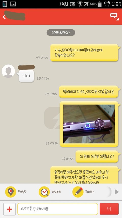 판매자에게 다시 번개톡을 해서 원래 상태가 이런것이냐 중간에 택배기사와의 마찰이 있어서