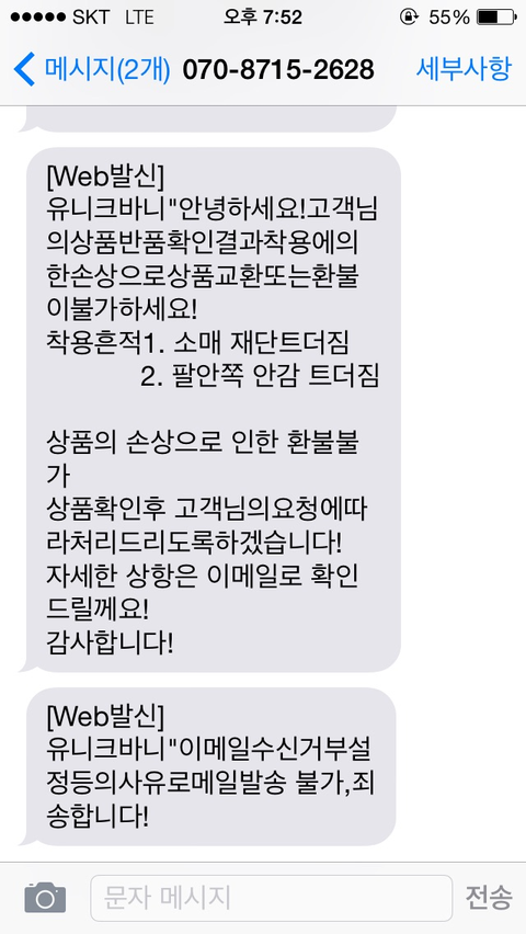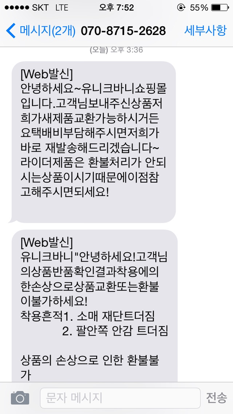 그러더니 제품은 환불이 안된다고..또 문자가 대신 새걸로 교환해주겠다더라구요