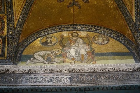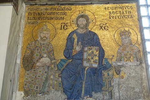 우리 시선으로 왼 편, 예수 기준으로 오른 편이 성당을 봉헌한 유스티니아노스고