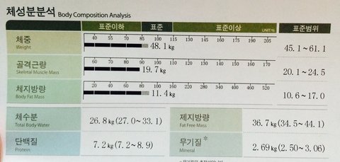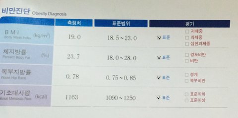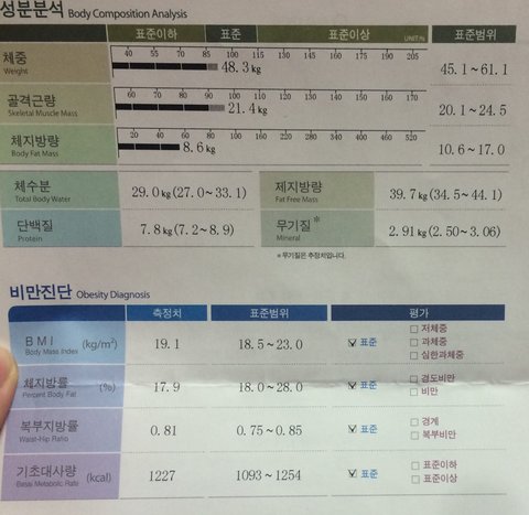 보면 아시겠지만 근육량은 표준이하에 지방이 높은편이였어요~~