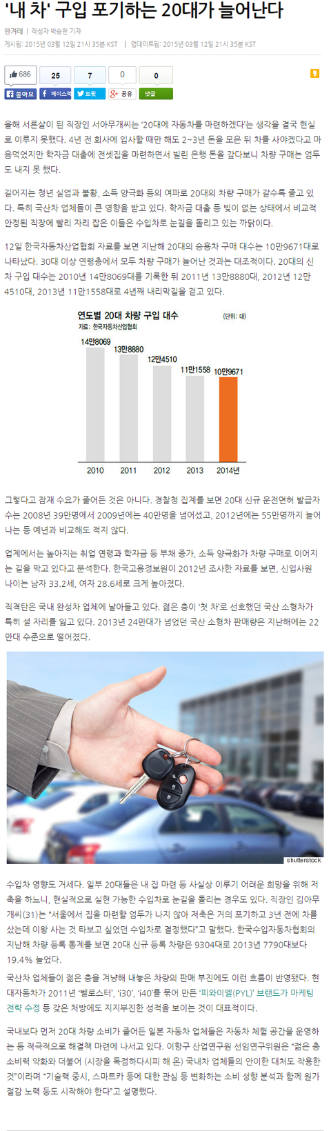 국산차를 구입하는 20대가 줄어 들어 국내차 업계들이 부진한 실적기를 겪고있다는 내용입니다.