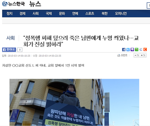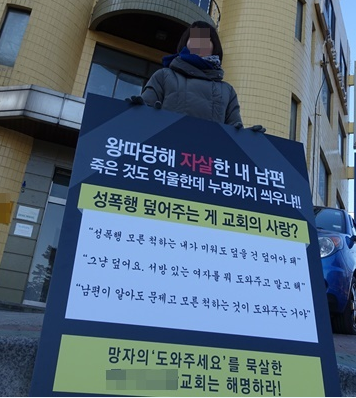 A 씨는 13일 오후 서울 송파구에 위치한 ○○교회 앞에서 “왕따 당해 자살한 내 남편 죽은 것도 억울한데 누명까지 씌우냐”, “성폭행 덮어주는 게 교회의 사랑?”, “망자의 '도와주세요'를 묵살한 ○○교회는 해명하라”고 쓴 피켓을 들고 시위를 시작했다.