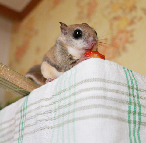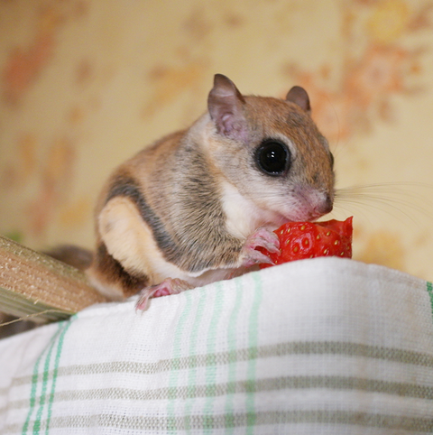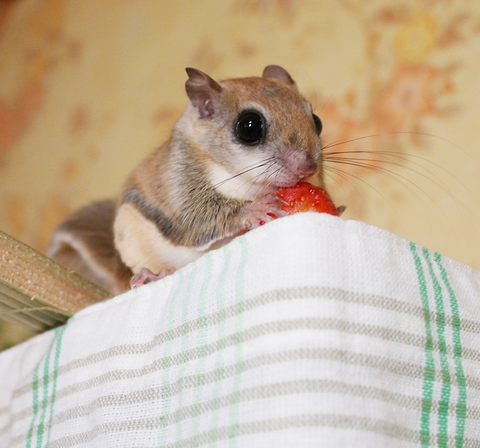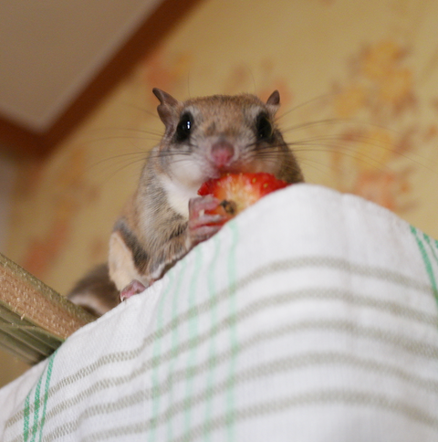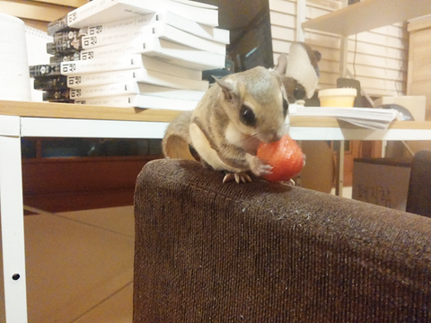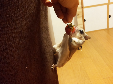 두루가 양손으로 딸기를 들고 거의 직립보행하여