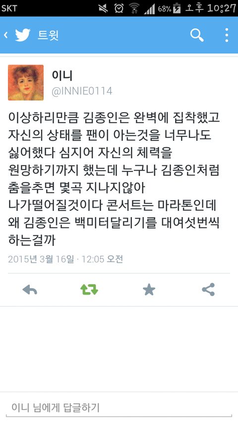 팬들이 완벽함말고 건강함을 더 좋아한다는걸 김종인이 알아줬음 좋겠다 실수몇번해도 우리가 괜찮다고 다독여줄순있는데 건강하지못하면 우리가 할수잇는건 아무것도 없잖아 그저 아프지말라 , 푹 쉬란말 말고는 해줄수있는게없어