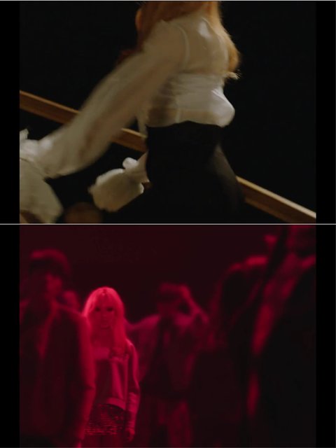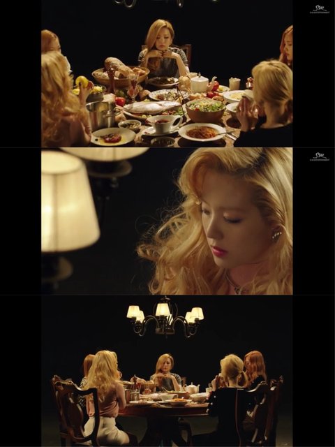 막판에 슬기가 다시 자리에 앉을때 아이린을 보면 포크를 잡고 음식을 먹고 잇고 이때는 전등이 안돌아가고있었고..또 원샷일때는 사과를 손에 들고 있음