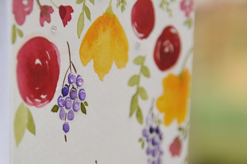아래 상세사진포도송이에 글로시악센트를 사용해서 물방을이 맺힌것 처럼 만들었어요.글로시악센트는 액체로 된거라 처음엔 끈적하니(풀같이) 그렇지만 시간이 지나면 저렇게 굳어져요.위에 꽃은 제가 직접 수채화 물감으로 그렸어요.