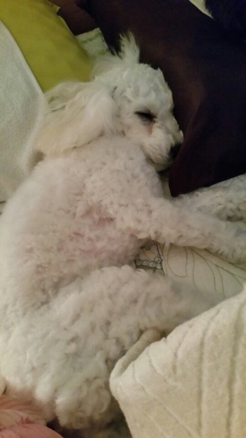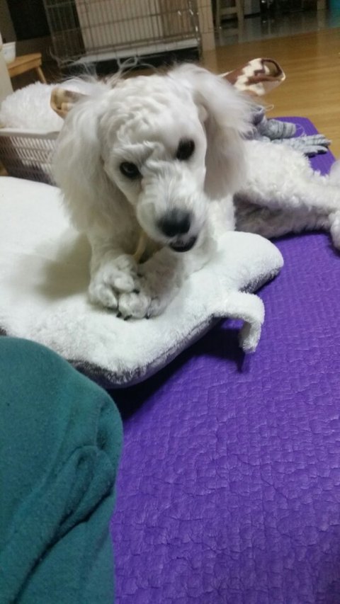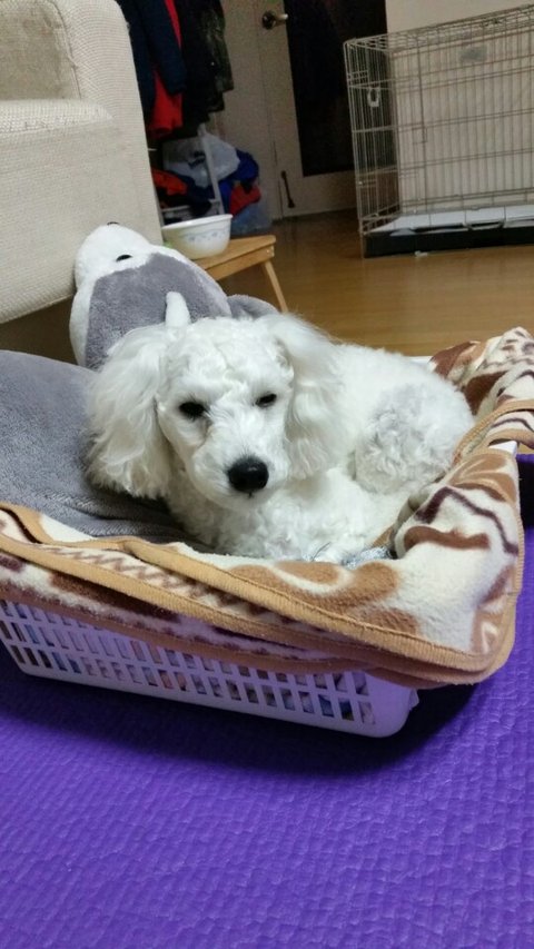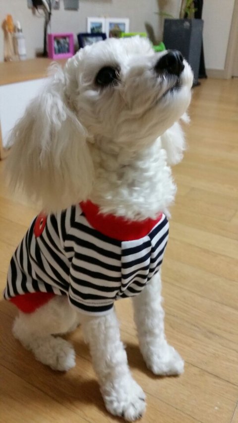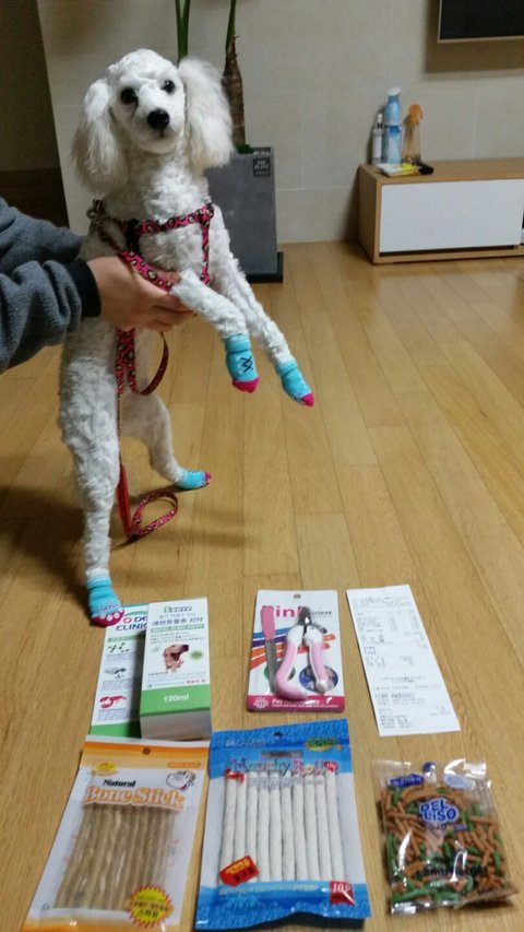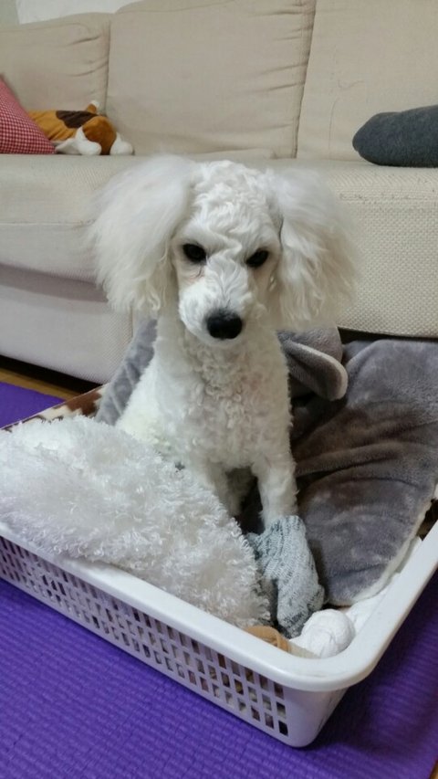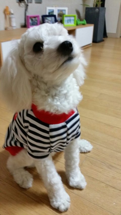 견종: 비숑프리제 (털이 짧아서 흰색 푸들처럼 보입니다)
