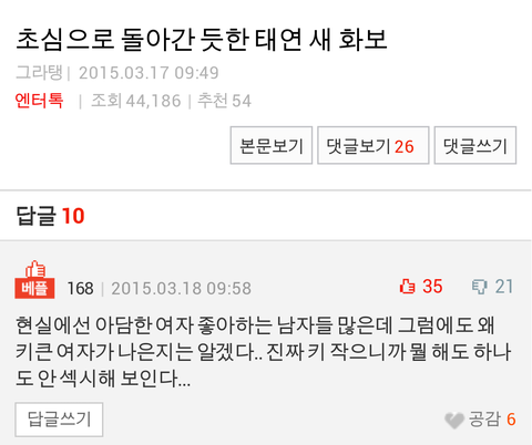 근데 태연같은 여돌들한테는 키 조카 작아 ㅋㅋㅋ 볼품없어 ㅋㅋㅋ 이러고있음