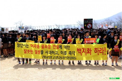 학교 뒷산에 추진하는 골프장 조성과 관련해 양산 경남외국어고등학교(교장 전병철) 학생 600여 명은 15일 오전 11시 10분 양산시 어곡동 교내에서 반대집회를 했다.