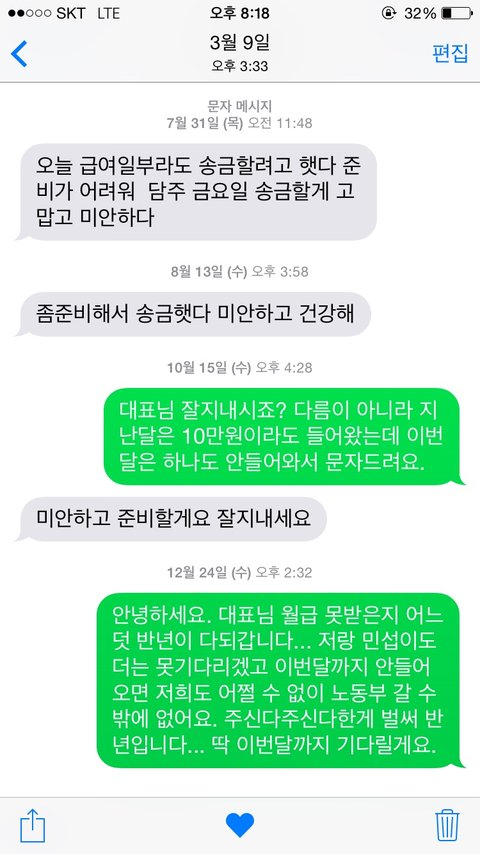 그래서 대표님께 여쭤보니까 장사가 너무 안되서 나눠서 주겠다. 이러시길래 알겠습니다 하고 기다렸습니다.