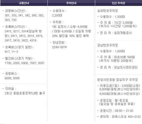 인근의 송파탄천주차장, 강남탄천주차장, 한강 시민공원 잠실지구 주차장 등을 이용할 수 있는데요.