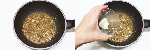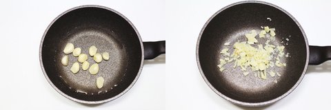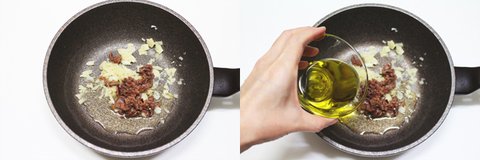 2. 으깬 마늘에 엔쵸비를 잘라 넣고, 올리브오일을 넣어 뭉근히 끓여주세요.