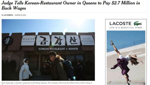 뉴욕에서 한국음식점 주인이 직원들한테 최저시급도 안주고 잔업 수당도 안주고