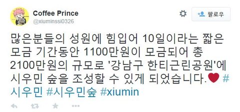 원래 커피프린스에서 먼저 천만원 기부하고 한국팬들도 모금 받았는데 10일동안 1100만원 모였대