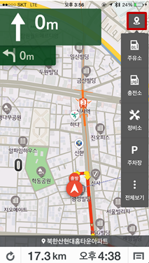 정비소, 주차장등의 정보가 필요할 때 오른쪽 위에 보이는 위치 메뉴를 통해
