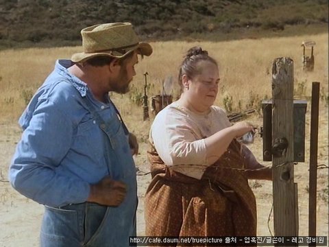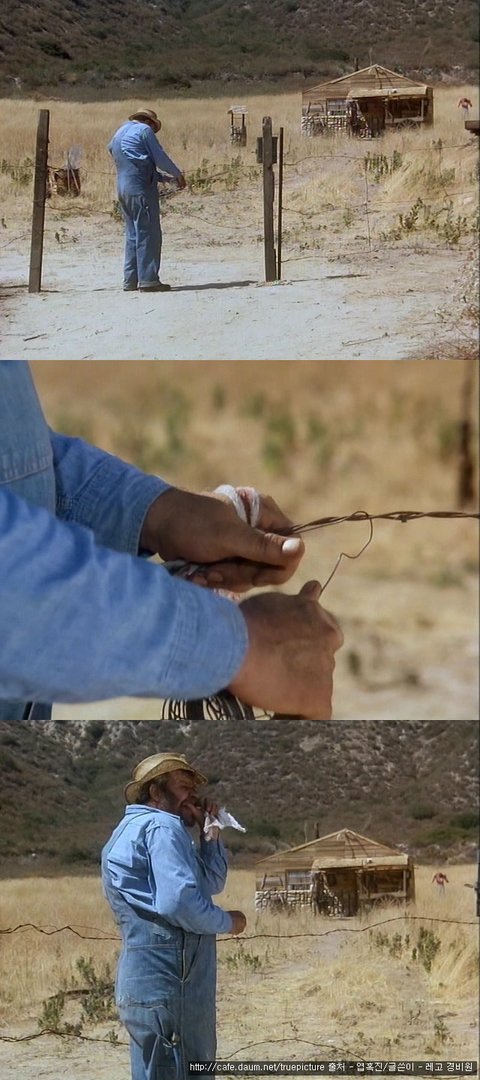 웬 농부 아저씨가 철조망을 치고 있는데 철조망을 묶을 때마다