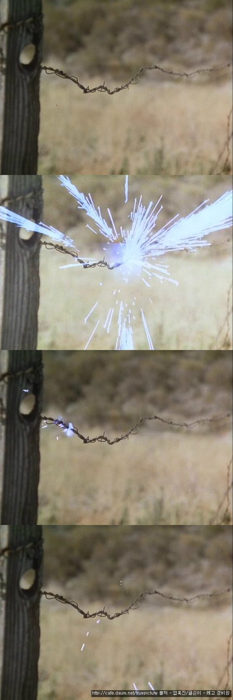 그러자 철조망에서 전기 불꽃이 튀기 시작합니다...