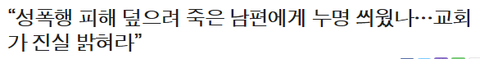 지난달 21일 경기도 의정부에서 숨진 채 발견된 ○○교회 신도 L(46) 씨가 교회 성폭행 피해자를 돕지 못한 죄책감과 교회 내 은폐 회유 분위기에 괴로워하다 목숨을 끊은 것으로 뒤늦게 알려진 가운데, L 씨의 아내 A(46) 씨가 이 교회 앞에서 ‘죽음의 진실’을 요구하는 1인 시위를 시작해 사회적 파장이 예상된다.
