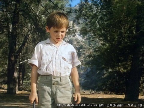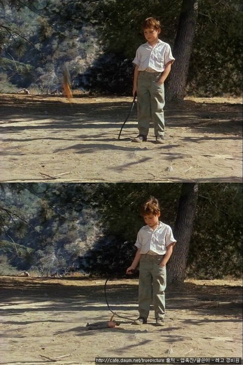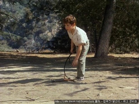 채찍을 휘두르는 웬 꼬마아이가 차에서 내려 숲속으로 달려갑니다.