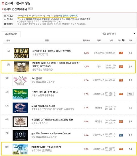 뭘좀 알고 쓰시길.. 작년 인터파크 콘서트예매순위 드림콘서트 제외하고 인피니트가 1위임.