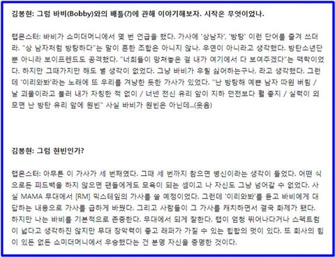 위는 랩몬스터가 2015년 가장 최근에 한 힙합플레이야의 인터뷰 중 일부이다.